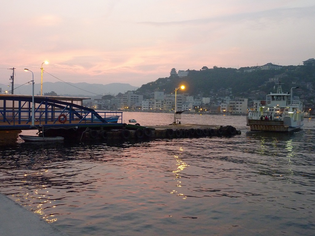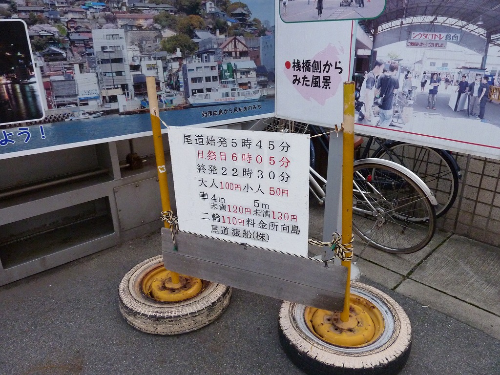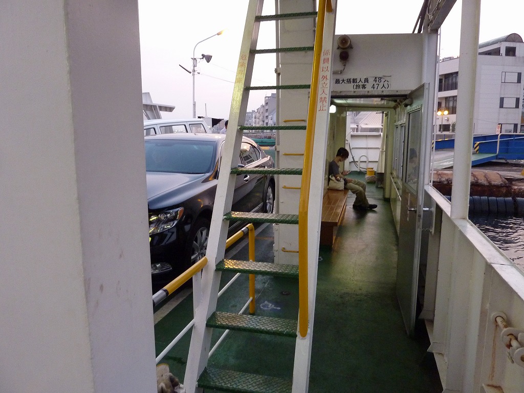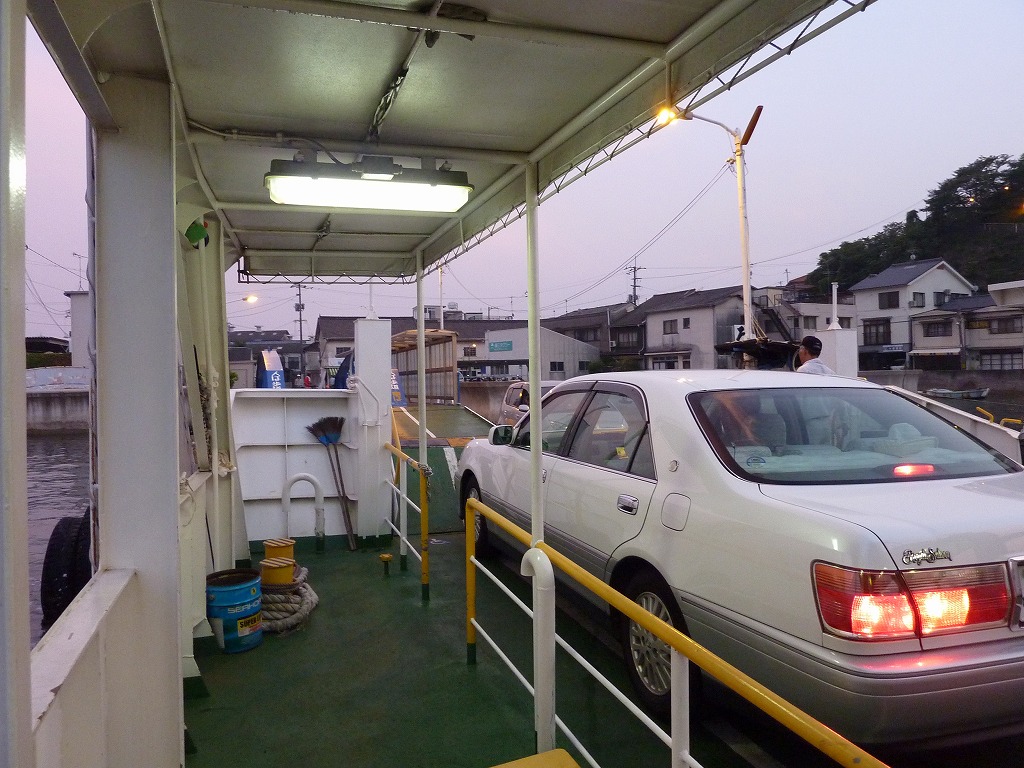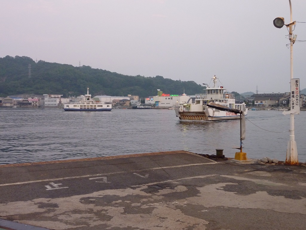 お腹も満ちて満足満足。 ぶらぶら歩きながら宿へ帰りましょう。 夕方の尾道水道は、涼しくて渡し船が静かに行き交い、 のどかでいい感じ。 散歩している人、おしゃべりしている人。みんな水面と向かい合い、思い思いの時を過ごしてます。 ここは、尾道の繁華街の真ん中編から、向島に出ている尾道渡船(株)の乗り場。 尾道の駅周辺からは、3箇所から向島に向けて渡し船が出ています。 地図で、赤い線で記した航路の乗り場にいます。 では、乗ってみましょう。 何の予定も計画も無しで。 渡し船は、出たばっかり。 車も、桟橋手前でええ子して待ってます。 わしも、ええ子して待っとるけぇ。はよ来てつかいな。 ↑料金表。大人100円、車120円。車には大人一人分の運賃が入っているので、20円差で車が乗る・・・ 来ました来ました。 あっという間に車、自転車が乗り込み、ベルが鳴りタラップが油圧で上がると、すぐ出港。 誰も切符も買っていないし、オカネは、払っていません。 あっちで、払えばいいのかな? 下関方面を見ると、尾道駅前から向島に行く渡し船も見えます。 狭いけど、船室↓ 操舵室へ上がる階段です。 鎖が無いからといって、上がって行きたかったのですが、立ち入り禁止です。 尾道の空も、だんだん夕焼けに。 数分で、向島に。 車のドライバーも、下船に向けてエンジン始動。 床下ではディーゼルエンジンが、クラッチを介しプロペラを逆転させて着岸を調整します。 向島では、素敵なネオン街が僕を待っていてくれました! ここまで来てパチンコかよ・・ 船賃を稼ぎに、突撃だ~。 |
