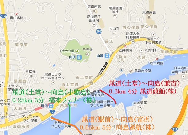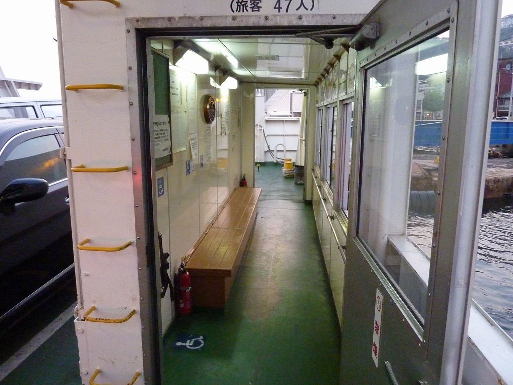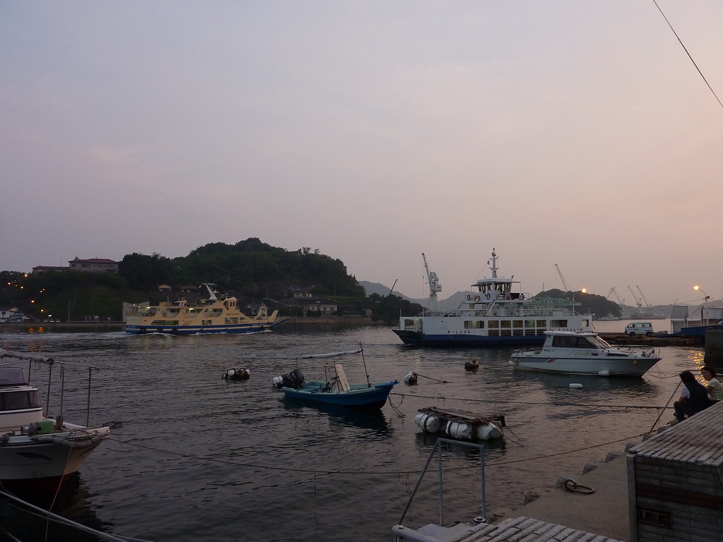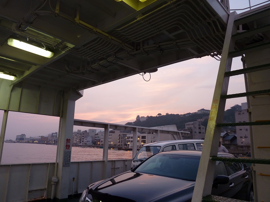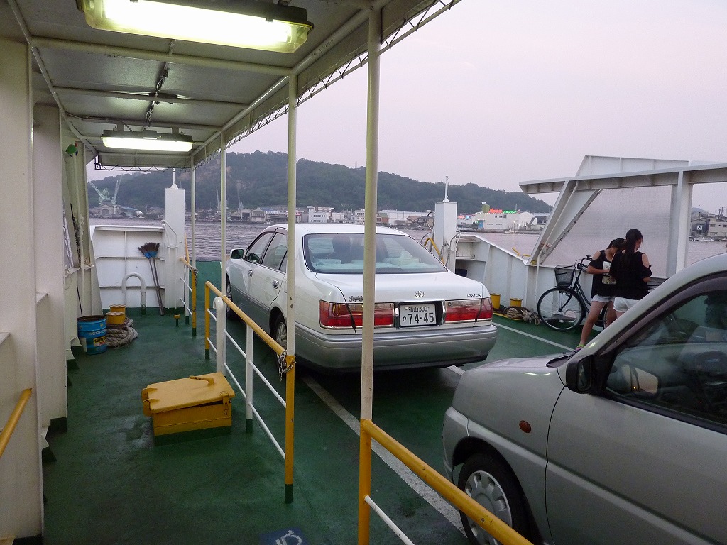 お腹も満ちて満足満足。 ぶらぶら歩きながら宿へ帰りましょう。 夕方の尾道水道は、涼しくて渡し船が静かに行き交い、 のどかでいい感じ。 散歩している人、おしゃべりしている人。みんな水面と向かい合い、思い思いの時を過ごしてます。 ここは、尾道の繁華街の真ん中編から、向島に出ている尾道渡船(株)の乗り場。 尾道の駅周辺からは、3箇所から向島に向けて渡し船が出ています。 地図で、赤い線で記した航路の乗り場にいます。 では、乗ってみましょう。 何の予定も計画も無しで。 渡し船は、出たばっかり。 車も、桟橋手前でええ子して待ってます。 わしも、ええ子して待っとるけぇ。はよ来てつかいな。 ↑料金表。大人100円、車120円。車には大人一人分の運賃が入っているので、20円差で車が乗る・・・ 来ました来ました。 あっという間に車、自転車が乗り込み、ベルが鳴りタラップが油圧で上がると、すぐ出港。 誰も切符も買っていないし、オカネは、払っていません。 あっちで、払えばいいのかな? 下関方面を見ると、尾道駅前から向島に行く渡し船も見えます。 狭いけど、船室↓ 操舵室へ上がる階段です。 鎖が無いからといって、上がって行きたかったのですが、立ち入り禁止です。 尾道の空も、だんだん夕焼けに。 数分で、向島に。 車のドライバーも、下船に向けてエンジン始動。 床下ではディーゼルエンジンが、クラッチを介しプロペラを逆転させて着岸を調整します。 向島では、素敵なネオン街が僕を待っていてくれました! ここまで来てパチンコかよ・・ 船賃を稼ぎに、突撃だ~。 |