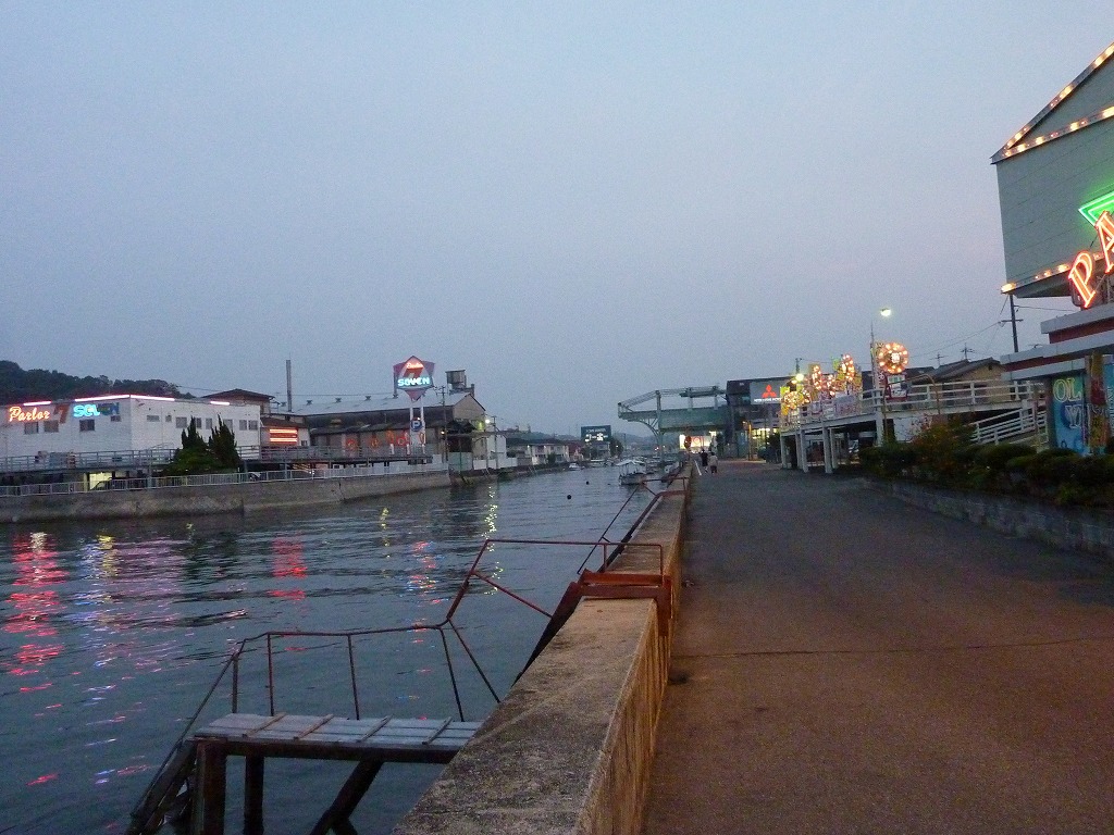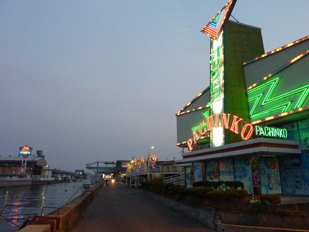 船から下りたら、地元の車や人は慣れた様子で波止場に立っているおじさんにお金を渡して行きます。 その様子を見習い、一番最後に自然に?料金を手渡す。 100円。 船は、尾道行きの車と客を乗せると、ジリジリジリンとベルが鳴りもう出港。 さて。 向島散策しましょう。 まず、 右手のネオンは、パチンコオリンピアですね。 尾道のパチンコ屋さんが、比較的混んでいるのと対照的に、こっちは正しい田舎のパチンコ屋さん。 人もまばら。 お年寄りと、作業服を着た鉄鋼関係の兄ちゃんが数人。 幾つかの台を触り、結果を出したのが”ハッピージャグラーV” B5回R1回で700枚位。 差し引きで1万円プラスに。 (この店、等価交換!予想外。) ▲余談ですが▲ 初めてのパチンコ屋に入って幸運にも大当たりして、景品に交換する意思があったら、早いうちに景品交換所の場所を探しておいたほうが良いと思います。 景品を持ったままうろうろと探し回るのはマヌケすぎるし、地元の悪漢に言葉巧みにカモられる可能性も無いとはいえません。 近頃は、店が場所を教えてくれない場合もあるので、一区切りついたら台はそのままで出入り口あたりを探しに行き、又は駐車場を見回せば不自然に小窓の開いたプレハブがあると思います。 それでも解らない場合は、予め景品を持った人を追いかけるしかありません。 地方は、解り易いですが、都会ほど解りにくくなる傾向があります。 道路挟んだところとか、ビルの4階、地下だとか、立体駐車場の中二階だとか・・ さて、調子こいてもう一件 船着場から、川の向かい側、パーラーセブンに。 直接はいけないので、奥に掛かっている橋を目指して歩く。 店から店へ、歩いて750m。 パーラーセブン、 客2人・・ パチンコは、サンドに札が投入できるタイプではなく、500円玉をサンドに投入して玉を借りる昔ながらの仕組み。 帰ろうかと思ったのですが、馴染みの台があったので1000円だけ。 パチスロ ヱヴァンゲリヲン~生命の鼓動~ エヴァは、ストーリーは良く知りませんし、そもそも、ロボットものアニメってあんまり好きではないんですが、このスロット台とは中々相性がよいのです。 1000円であっさりとボーナス。 飲まれることなく続いて数回のボーナス、二人の店員さんがこちらを見ながら何か話している・・ スロットコーナーには私一人、それでボーナス続発ですから目線が痛い。 まぁ、結果的にだいぶ返してしまい、400枚ほど交換。 この店は、6枚交換(6枚で100円)でした。 交換するときには、客より店員のほうが多かった。 向島の桟橋から見た尾道市街。 さあ、もう夜ですから帰りましょう。 あんまり遅くなると、帰りの船が無くなる。22:30位で終了です。 波止場に料金徴収のおじさんはもういなくて、船の甲板のおじさんが徴収係をかねておられました。 向島でお世話になった遊技場。 パチンコオリンピア パーラーセブン |