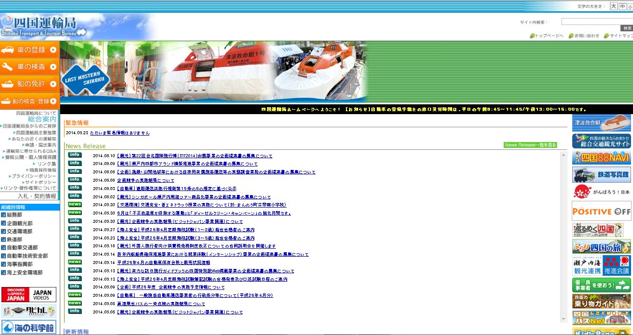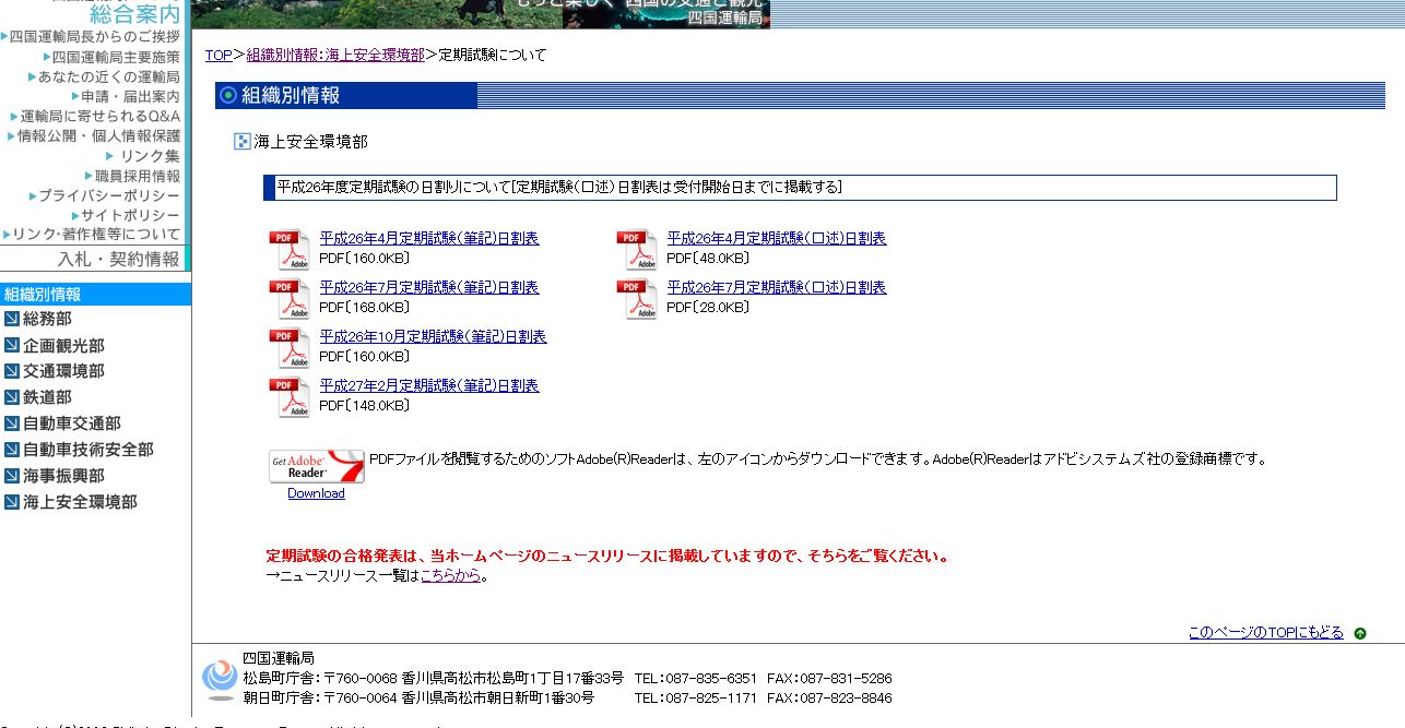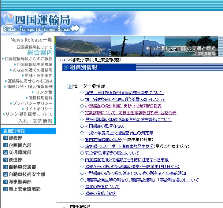 トップページから左側に大きく"船の免許”とあるのですが、ここは小型のみ。残念。 そこの下のほうの、組織別情報から“海上安全環境部”をクリック。 目立たないですが・・・ 定期試験について 海技士国家試験日割表・合格発表 PDFアイコンでファイルデータ量まで書いてある親切さ。 合格発表はヒトくくりになっていなくて、ニュースリリースのリンクが貼ってある。 ↓ 定期試験の合格発表は、当ホームページのニュースリリースに掲載していますので、そちらをご覧ください。→ニュースリリース一覧はこちらから。 申請先や、問合せ先、必要書類の確認やFAQ等が見当たらない・・探せばあるのかもしれないけど、一元表示して欲しいです・・ 四国局で困った事があったら、他局もたどって参考にされたし。 PR |