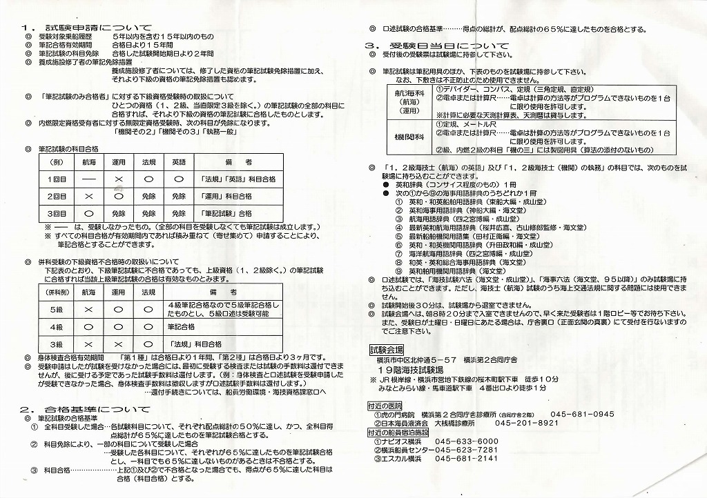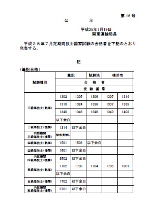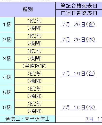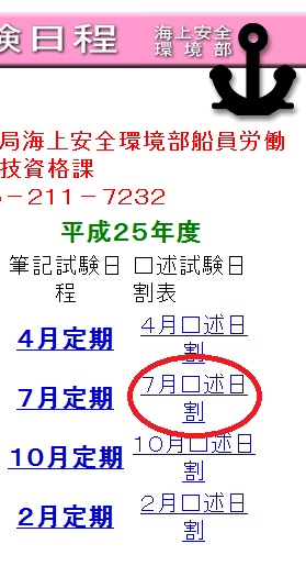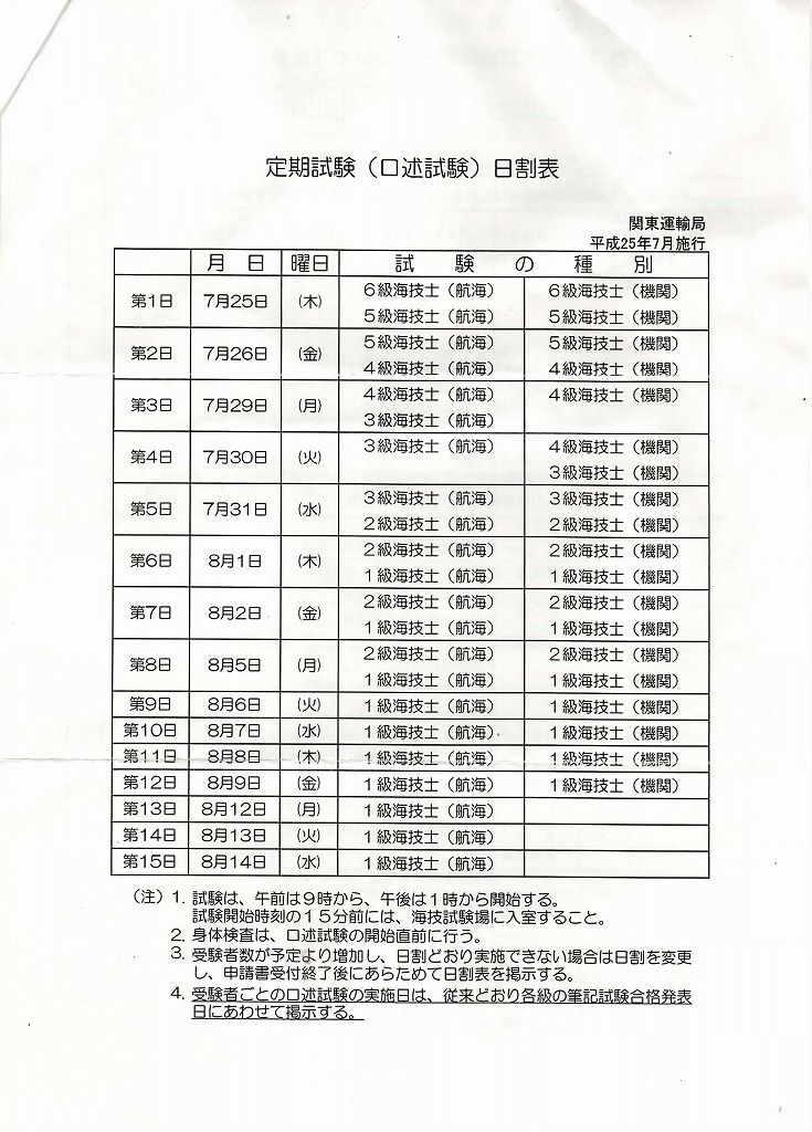 海技士口述試験は、受験日が正確にわかりません。 海技士定期試験は、初めにに、口述試験の日程が発表されます。 Webで見る事が出来ます。 http://wwwtb.mlit.go.jp/kanto/kaiji_sinkou/senin/exnittei/index.html (後日送られてきた書類をスキャンしたものです。汚くてすみません・・) この定期試験日程表は、数ヶ月前から閲覧する事が出来ます。 申請受付期間が記載してあります。 ただ、この日程表から解るのは、筆記試験の日程と、時間割、問題数です。 口述試験のみを受験する場合は、申請は出来ますが、日程はまだはっきりとわかりません。 一番下に、小さく書かれている・・ 筆記試験合格発表日・口述試験日程発表日である7月1日の発表日 を頼りにするしかありません。 ↓ 7月1日頃に、関東運輸局のサイトの、口述試験日程表のリンクをたどると、大まかな日程がようやく発表になります。 クリックすると・・・ 私が受験するのは、内燃限定3級海技士(機関)です。 見る所は、3級海技士(機関)の枠です。 どうやら、7月30日の午後か、31日の午前が受験日らしい。 何日何時と正確にわかるのは、筆記試験合格発表日に、日程が同時に発表になります。 関東運輸局のサイト、 7月1日発表 ”海技士国家試験合格発表”から入っていくと・・ 筆記試験合格発表日/口述日割発表日が、軒並み掲載されております。 ↓ それでは、7月19日(金)に、筆記合格/口述日程を見てみましょう。 まず、筆記試験の発表です。 続いて、科目合格等の発表の後・・ 最後に、ようやく口述試験日程表。 7月1日の時点では、7月30日の午後か、31日の午前の予定だったのだが、ある程度の組みなおしがあった様で、ここでようやく内3級海技士(機関)の受験日が確定しました。 申請から約2ヶ月たって正確な受験日、時間がわかるこの試験・・。 休暇が受験日にハマれば言う事ないのですが、もし、どうしても日程が・・と言うヒトは、運輸局に相談してみる、って手もあるらしいです。 個人的には、午前中が良かったな~。終わったら遊べるから。 |