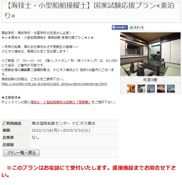 海技士筆記試験は、2日間にまたがって実施される為、遠くから受験する場合は宿を取る必要が出てきます。 4級を受験した時は、たまたま船が近くに停泊していたので、1日目が終わると船に向かい、宿代わりに使わせてもらいました。 慣れた環境で勉強が出来たので、翌日への調整は概ね良好でした。 3級受験時は、船の停泊が期待できなかったので、みなとみらい、桜木町周辺の安い宿を予め探していたのですが・・・ 桜木町の北側に、カプセルホテルに小さな個室がついたホテルを狙っていたのですが×。 ならばと、周辺の東横インは・・× なんと、横浜でAPECの開催期間と重なり、どうやら警察をはじめとする警備関連で宿があちこち満室に。 安宿ばかりチェックしていて、確認が後回しになっていたのが”ナビオス横浜” 試験会場から川を隔てた所に位置し、アクセスはとても良い。 高そう・・・ 好立地で、綺麗なナビオス横浜は海員組合の厚生施設 だけど、とっても高そう・・・ しかし、海事関係者は割引がある模様。 しかも、この時は海技試験受験者は受験票を見せると更に千円位割引になり、六千円前後で宿泊できた、様な記憶が・・・ (当時のWeb) 価格、空き室は電話で問合せの様で、チェックイン時に受験票の提示を求められます。 写真は和室ですが、私のときは洋室を提供していただきました。 その模様は後日またUPします。 PR |