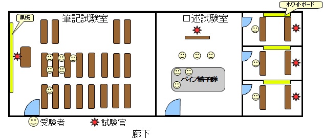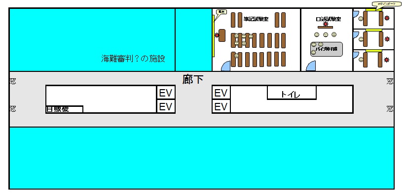 (ストリートビューより、建物スパッと切れてますが・・) 本町5丁目の大きな交差点を渡り、横浜第二合同庁舎の中へ。 こちらの方角からは、ビルの左手あたりに地味ですが入口があります。 入口には守衛さんが立っています。 駅で見るような自動改札があり、専用IDの無いビジターは、必ず躊躇しますので守衛さんに声を必ず掛けられます。 行き先を聞かれますので、”関東運輸局の海技試験会場”です。 と告げると、オレンジ色のIDカードを首から提げるよう渡されます。 ※平成28年7月より、海技試験会場は19階から3階へと変わりました。 以下の間取りなどは過去のものとなります。イメージとして読んで下さい。 エレベーターに乗って19階に。 試験の実施日には、スーツ姿のココで勤めておられる方がたとは違うナリの若者がエレベーターで一緒になったりします。 たいてい、同じ階で下りたりします。 19階は、こんな感じだっけか? 更に、試験会場を記憶だけマップです。 試験会場に入ると、黒板や紙に受験番号による席割が掲示してありますので、指定どおりに座ります。 関東運輸局の試験会場は、8時45分集合です。 学生服を着た高校生や、在職中と思われる20代の若者、私のような経緯で受験なのか30代~が静かに座って、試験前の最後の追い込みをしています。 全体的に、服装は地味です・・ アキバ系とまではいきませんが、あんまり派手な格好のヒトはいません。 筆記会場は、スーツを着ておられる方もおられた気がしますが、服装は、筆記口述とも制約が無いので、たぶん自由です。 ま、口述はどうやらキチンとした格好がベターらしいという伝説が・・・このハナシは後述します。 8時45分になると、試験官が数人入ってこられ、開口一番参考書などを仕舞う様指導されます。 今一度、鉛筆と消しゴム、電卓以外のモノを仕舞うように言われ、試験にあたっての注意事項等を説明されます。 途中退出が可能な経過時間もここで説明されます。 |