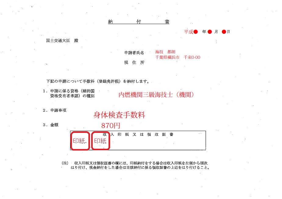 気をつけるのは、口述試験手数料と、身体検査手数料は別の納付書、 つまり2枚作成しなければなりません。 PDFで予め作っておくと、便利です。 以下に、一例をUPします。 以下に示すのが、口述試験を郵送申請する場合に必要となる書類です。 海技試験申請用紙(1) (乗船履歴を書き込んだ)海技試験申請用紙(2) 海技士身体検査証明書 乗船履歴証明書 受験票 写真二枚 口述試験手数料 身体検査手数料 返信用封筒 コレさえ揃えば、受付期間内に郵送して、無事受験票が来るのを待つだけです。 試験課の職員さんに開封してもらうタイミングが少しでも早いほうがエラーがあった場合の対処がし易くなると思います。 受付開始が月曜日であれば、前の週の金曜日に郵便局に持ち込むと、おおよそ月曜日に一番で届くと思います。 |