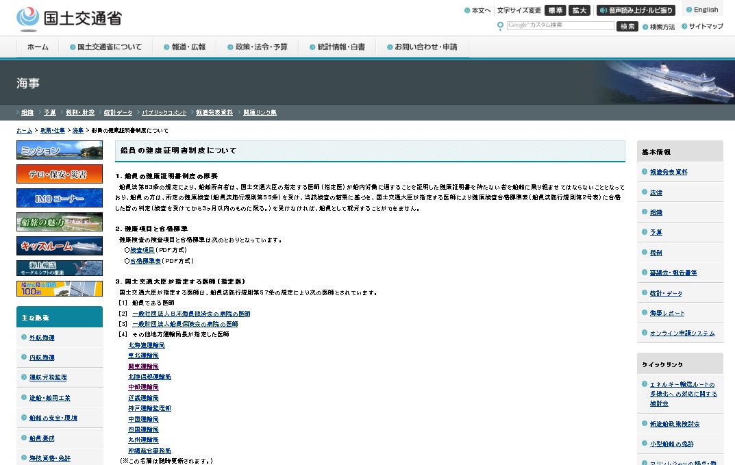 筆記試験では必要なかった海技士身体検査証明書が口述試験では必要になってきます。 これは、事前に自分で病院に赴き、医師によって簡単な健康診断をしてもらい、記入、署名してもらう必要があります。 私の受験した頃は、特に医師の指定もありませんでした。 従って、あんまり無いだろうと思われる健康診断様式なので、大きい病院に持ち込むと話がややこしくなり、門前払いを食う可能性や待たされる可能性があるので、街の住宅地にある普段だったら行かないような、小さな個人病院を尋ねてみました。 最近、法律が変わって、様式も変わり,「海技士身体検査証明書」の交付は、 試験開始期日前6か月以内に 指定医師 (船員法に基づき指定を受けた医師) に限られています。 国土交通省のサイトより、 ホーム>政策・仕事>海事>船員の健康証明書制度について より、指定病院の検索が出来ます。 余談: 船員になってからも、年に1度の船員手帳健康診断も、こちらの病院でないと健康診断を受ける事が出来ません。 健康診断を受けないと、継続して乗船が出来ません。 PR |