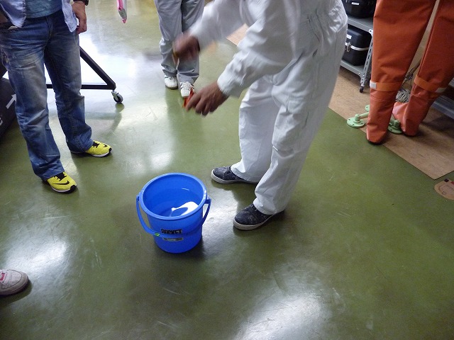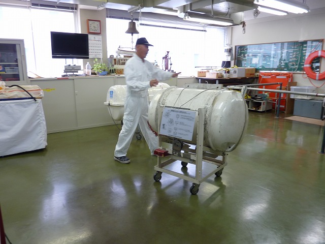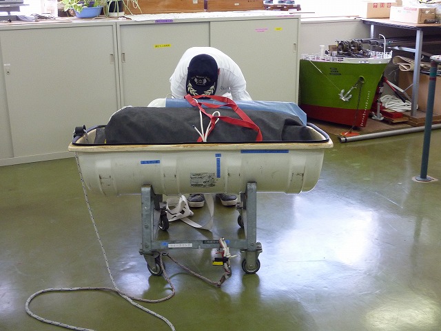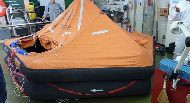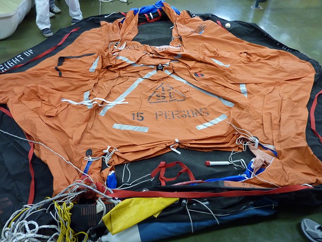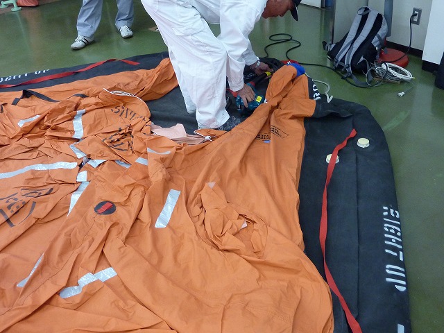 いかだの展張、海面着色剤の実験に続き、今度は、救命いかだに搭載されている