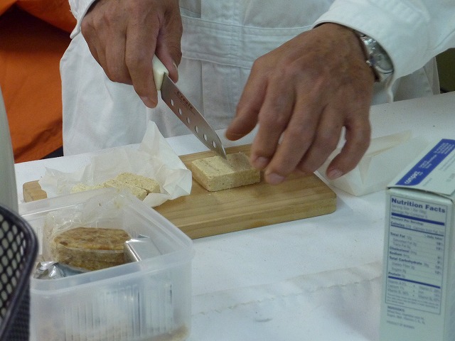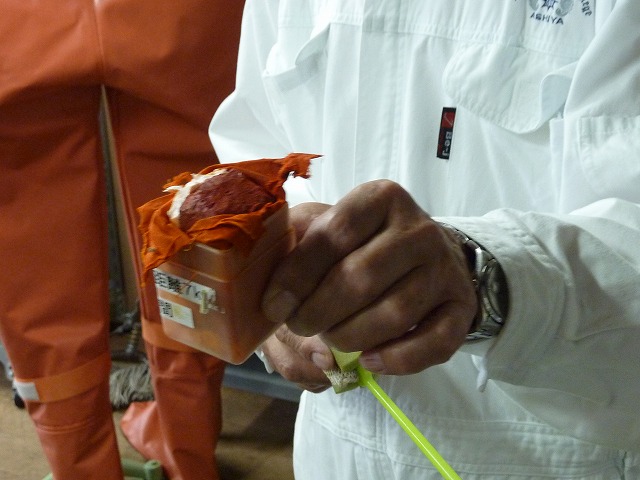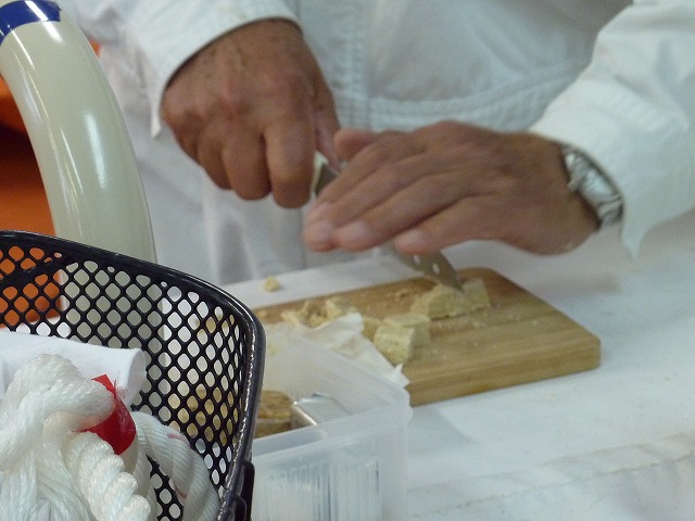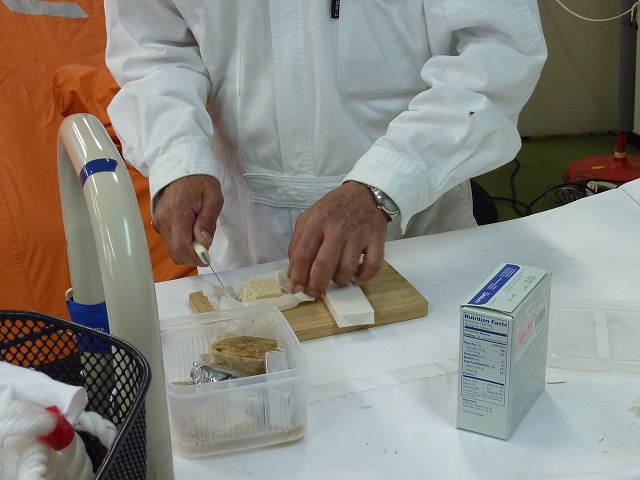 非常食の試食タイム。 救命いかだには、1人が3日分生きられる、必要最低限のカロリーを供給できるだけの水と固形食が備えてあります。 暑い中も、寒い中も、有事に備えてコンテナの中のいかだの中の袋の中でじっとその時を待っています。 先生が、サイコロ大に切り分けてくれます。 結構硬いようで、先生は左手を包丁にあてがい切っておられました。 味は、カロリーメイトをバサバサに乾燥させた感じで、若干甘い。 食感はざらざらした粒と、油脂分で口の中がべたべたに・・・ ナッツのフレーバーが口の中に広がり、アメリカさん好みの味でした。 海大の生徒は、3日間の規定の非常食と水で活動する訓練をするそうです。 絶食ではないものの、さぞや娑婆の食い物が恋しくなるんだろうな・・・ |