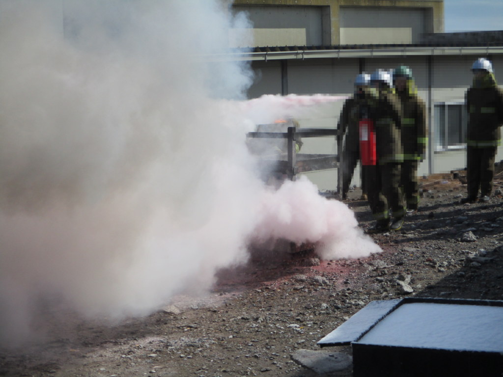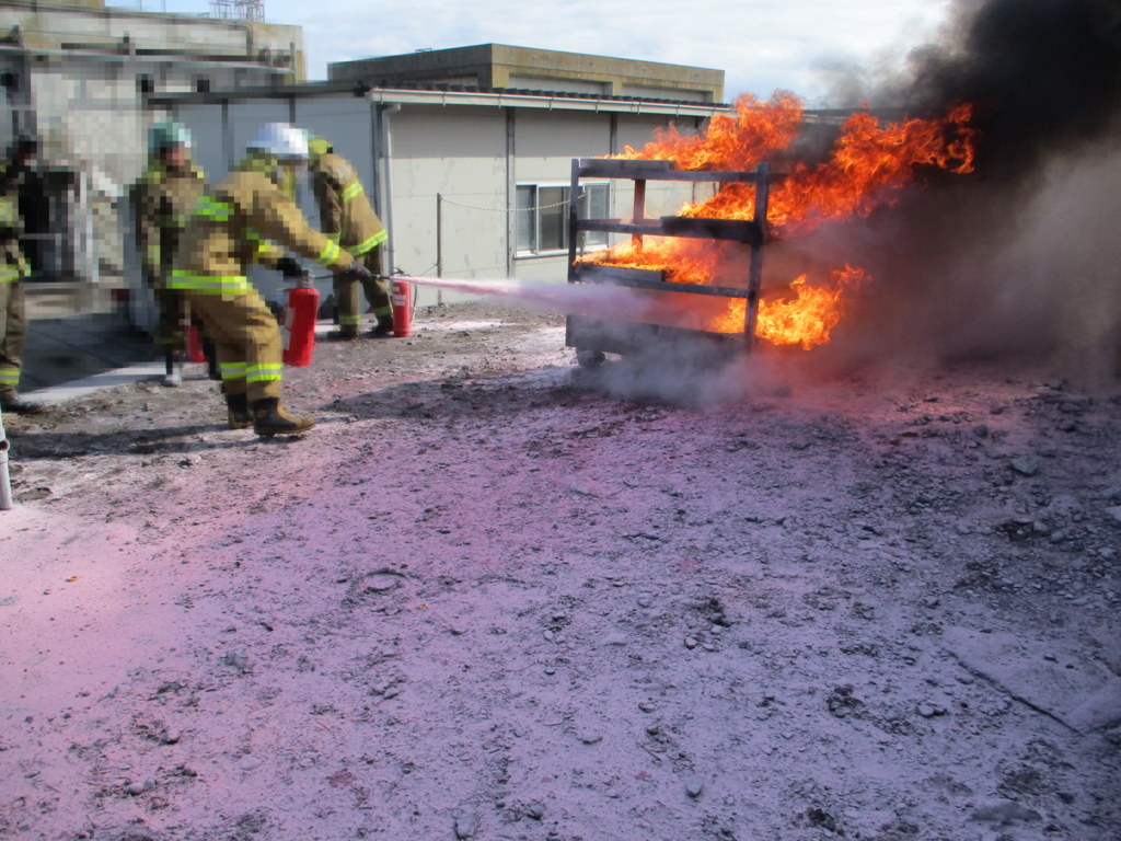 まず、教官が一種類づつ消火実施し、操作方法や特性を解説。