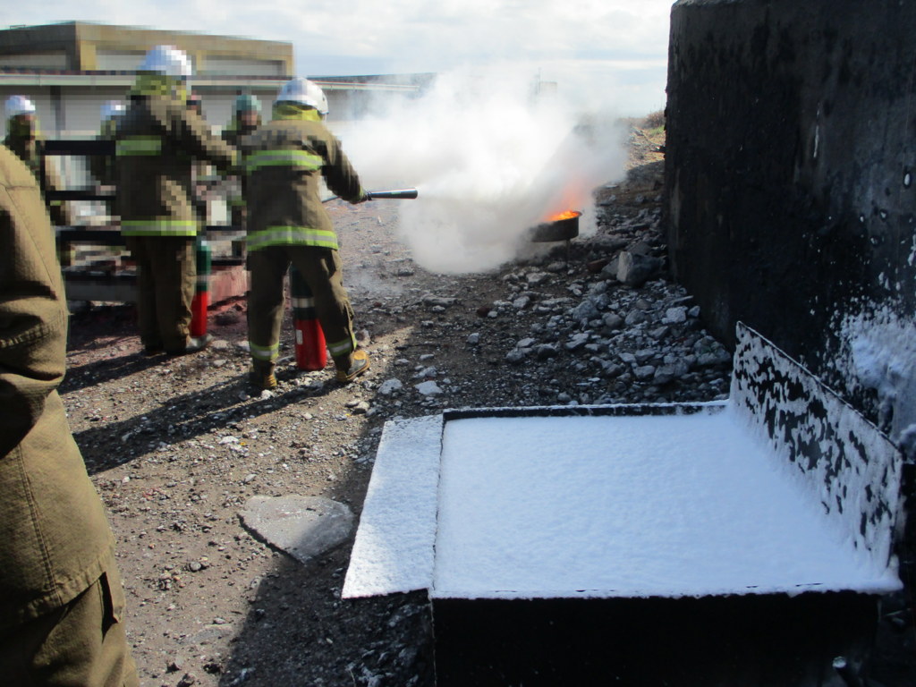 ABC消火器、泡消火器、CO2消火器の実践訓練。